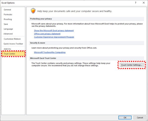 - از مسیر File > Options > Trust Center > Trust Center Settings وارد شوید.
