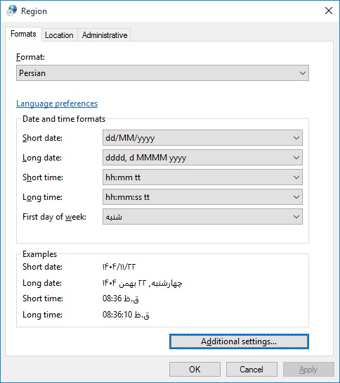 - در تصویر بالا تنظیمات فارسی (Persian) انتخاب شده که باعث میشود تاریخ به صورت شمسی و روزهای هفته با نام فارسی نمایش داده شوند.