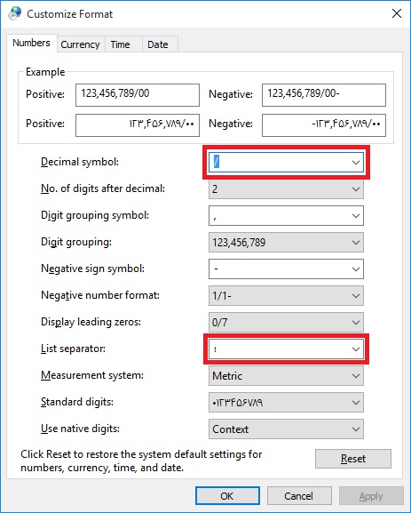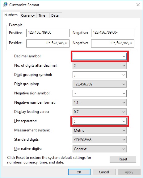 برای جلوگیری از بروز خطا در محاسبات، اطمینان حاصل کنید که تنظیمات Decimal symbol و Digit grouping symbol با فرمت مورد نظر شما هماهنگ است. میتوانید این موارد را از طریق Control Panel > Region > Additional settings تغییر دهید.