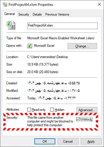 - در تب General، اگر پیام امنیتی با عبارت "This file came from another computer..." وجود دارد، گزینه Unblock (رفع انسداد) را تیک بزنید و OK کنید.