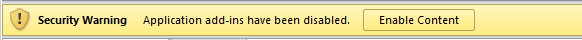 تصویر `yellowbar.jpg` نوار امنیتی را نشان میدهد: "Security Warning Application add-ins have been disabled. Enable Content". این هشدار زمانی ظاهر میشود که فایل حاوی ماکرو یا افزونه باشد و بر اساس تنظیمات Trust Center غیرفعال شده باشد. با کلیک Enable Content میتوانید محتوای فعال (ماکروها) را برای این جلسه اجرا کنید.