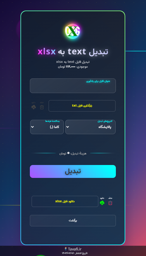 با کلیک روی دکمههای «تبدیل فایل MS-DOS به Excel» و یا «تبدیل فایل Excel به MS-DOS» به بخش بارگذاری فایل وارد خواهید شد.