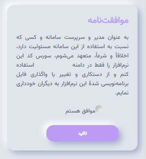 پس از ورود به آدرس سامانه برای نخستین بار این صفحه مشاهده خواهید کرد. این صفحه با کلیک روی گزینه موافق هستم، و کلیک روی دکمه تأیید، بسته میشود.