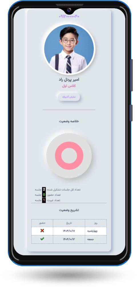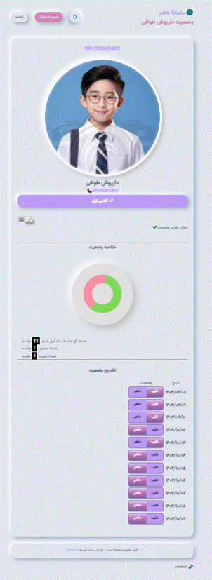 وضعیت حضور و غیاب هر دانشآموز بهصورت خلاصه و تفصیلی قابل مشاهده است. -